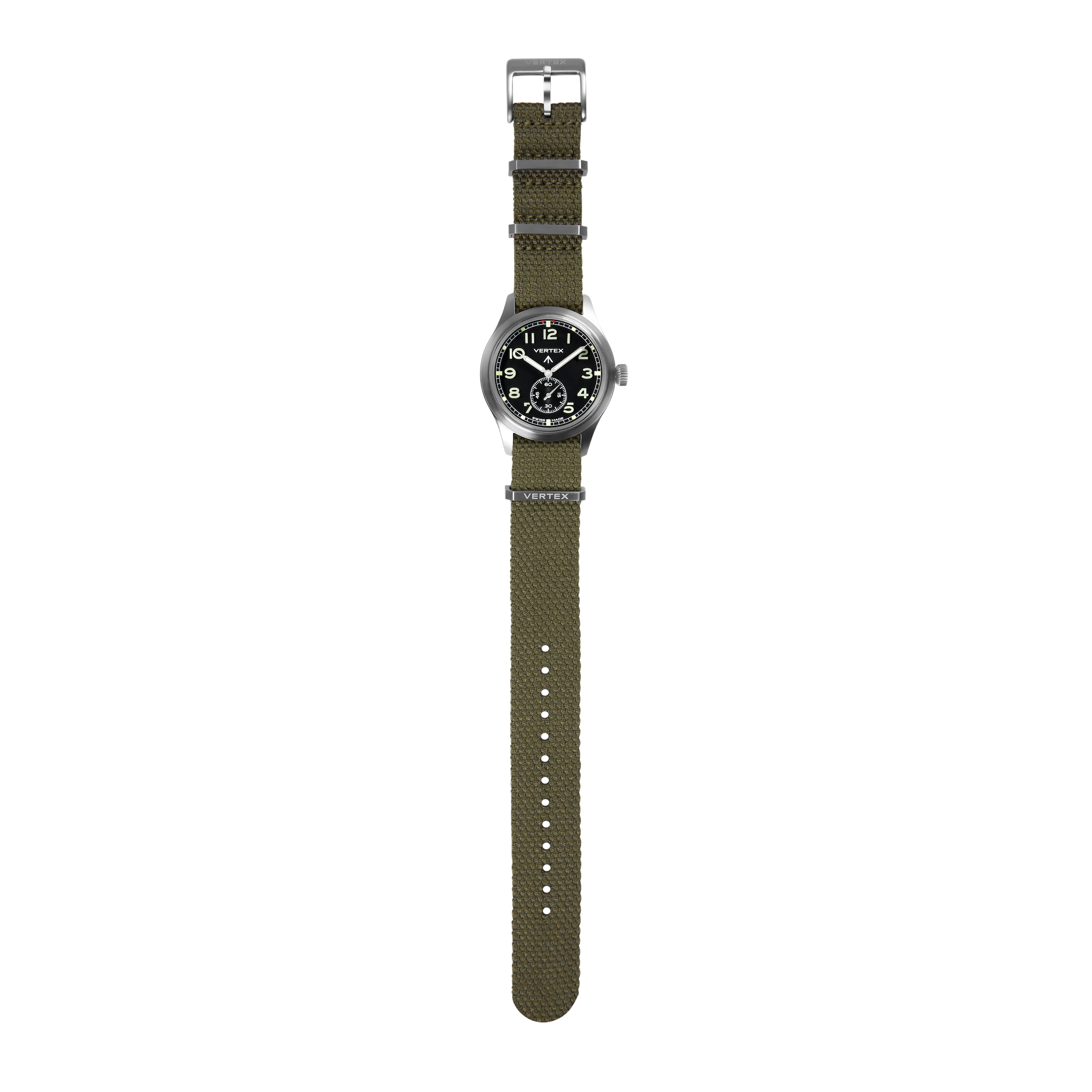 True to the Vertex mono-pusher design from 1945, the MP45 dial features a chronograph with a centre second hand and right side minute counter. The left sub display shows natural seconds.