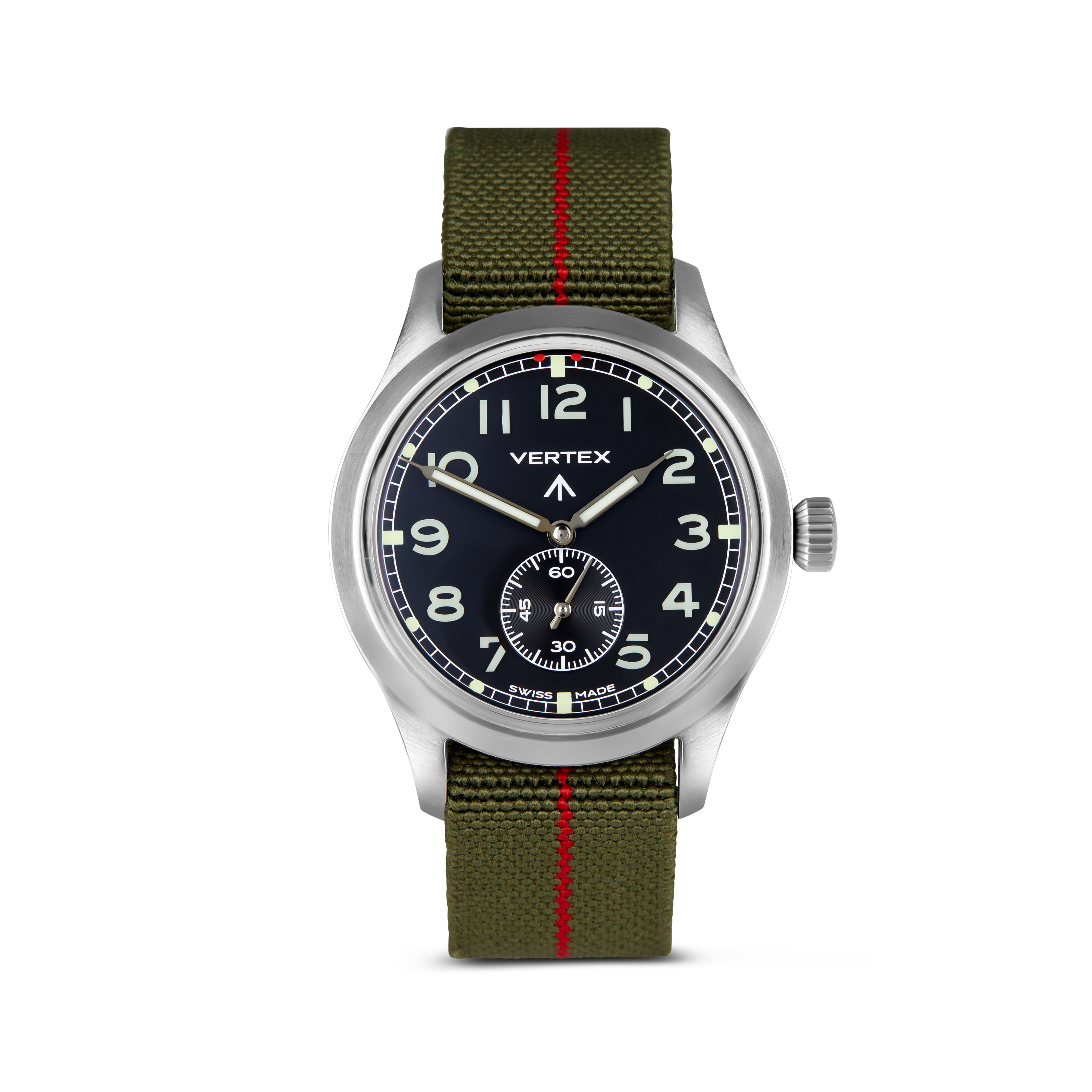 A classic 18mm black calf leather strap, designed to fit the Vertex M36. Finished with a brushed steel Vertex pin buckle for a refined and durable look.