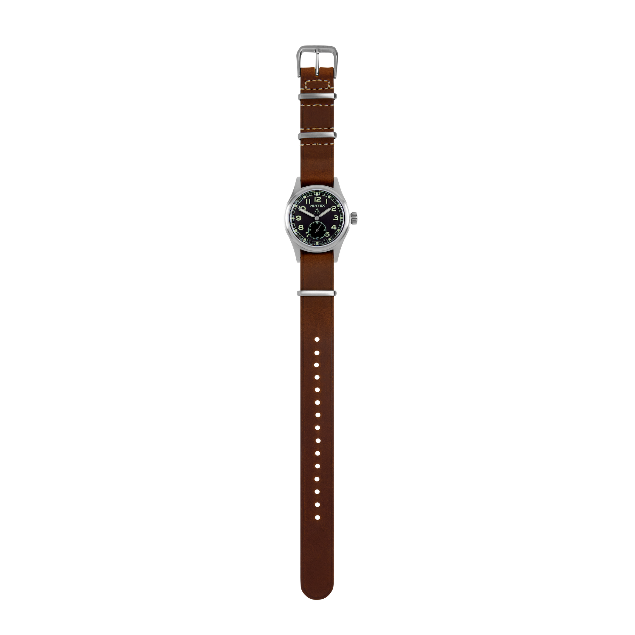 The Bronze M36 black dial is meticulously crafted timepiece, designed in homage to the model we originally created for the British during the Second World War. The Bronze CuSn8 case develops a patina over time, revealing the passage of years and adding a rich hue to the watch's appearance.