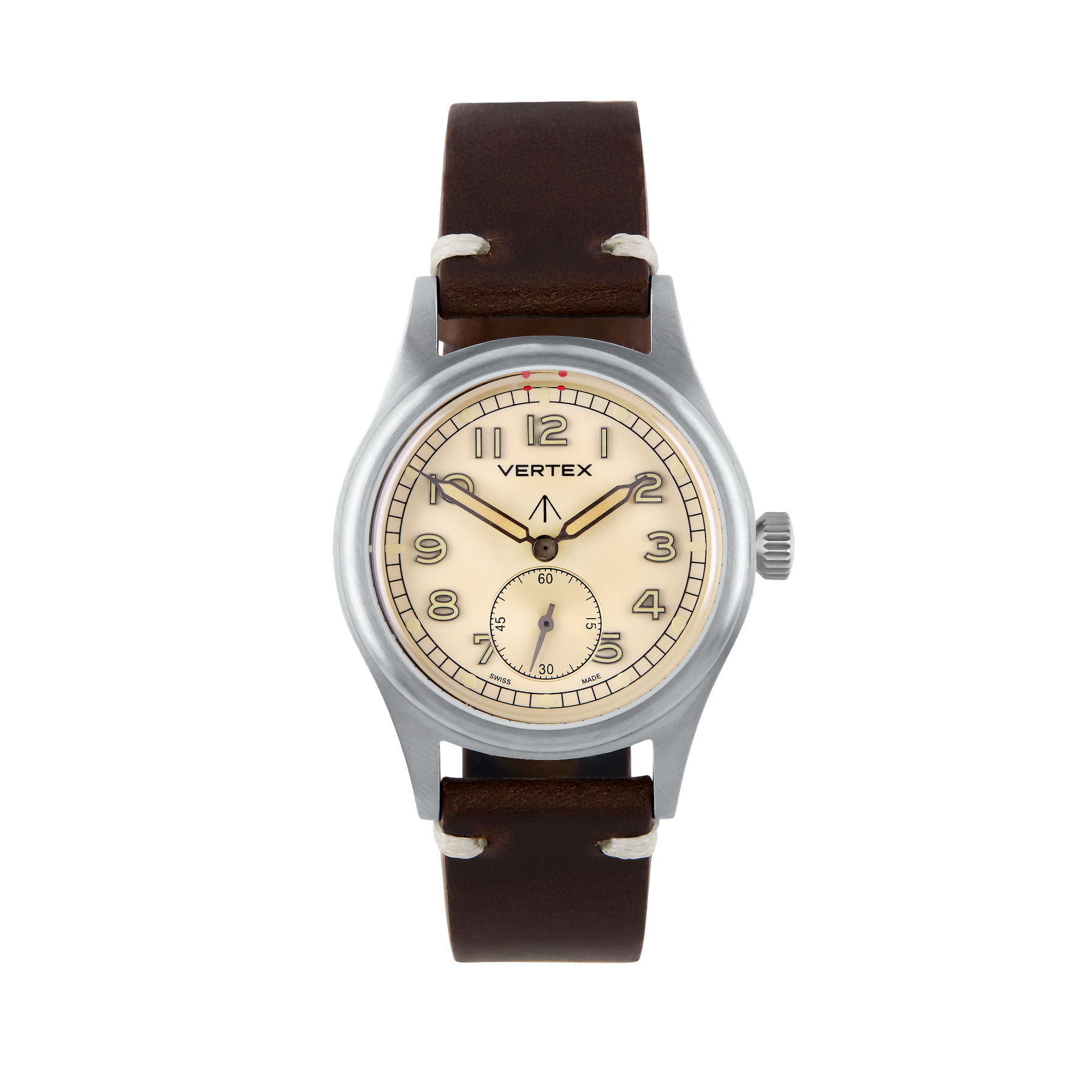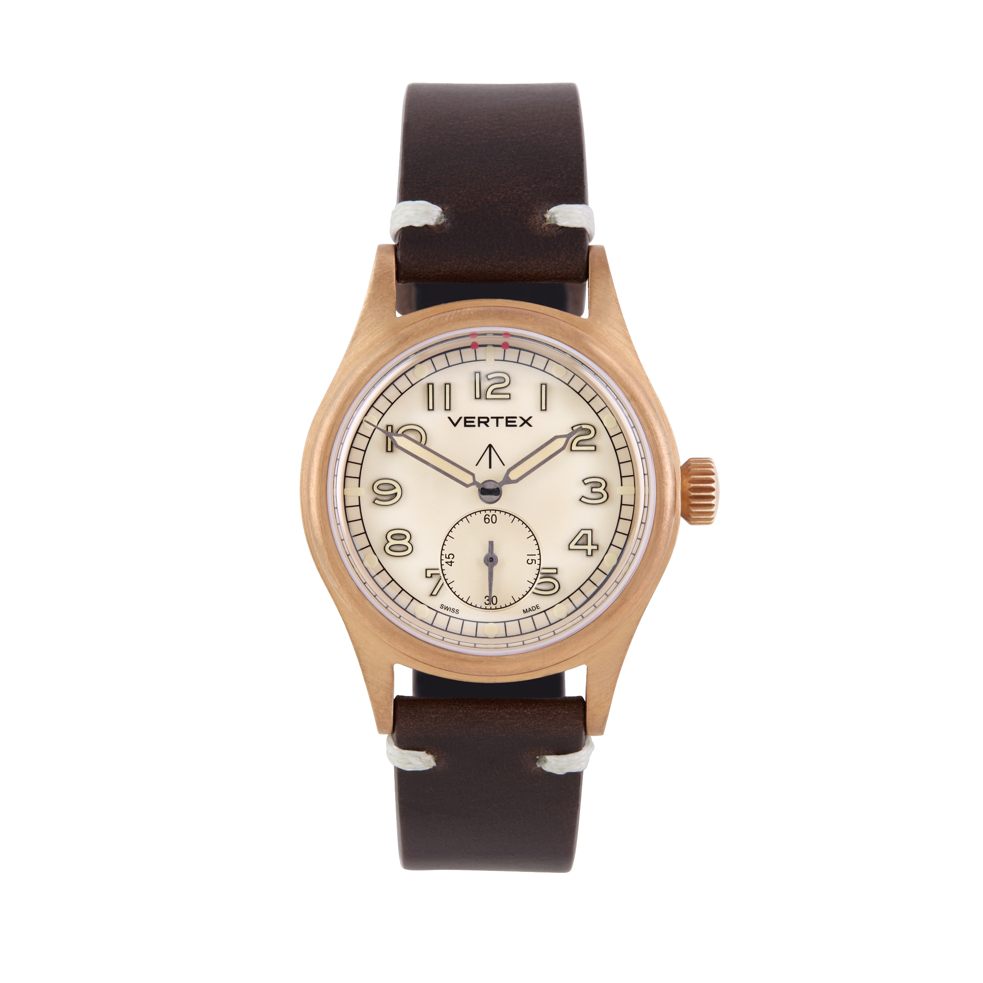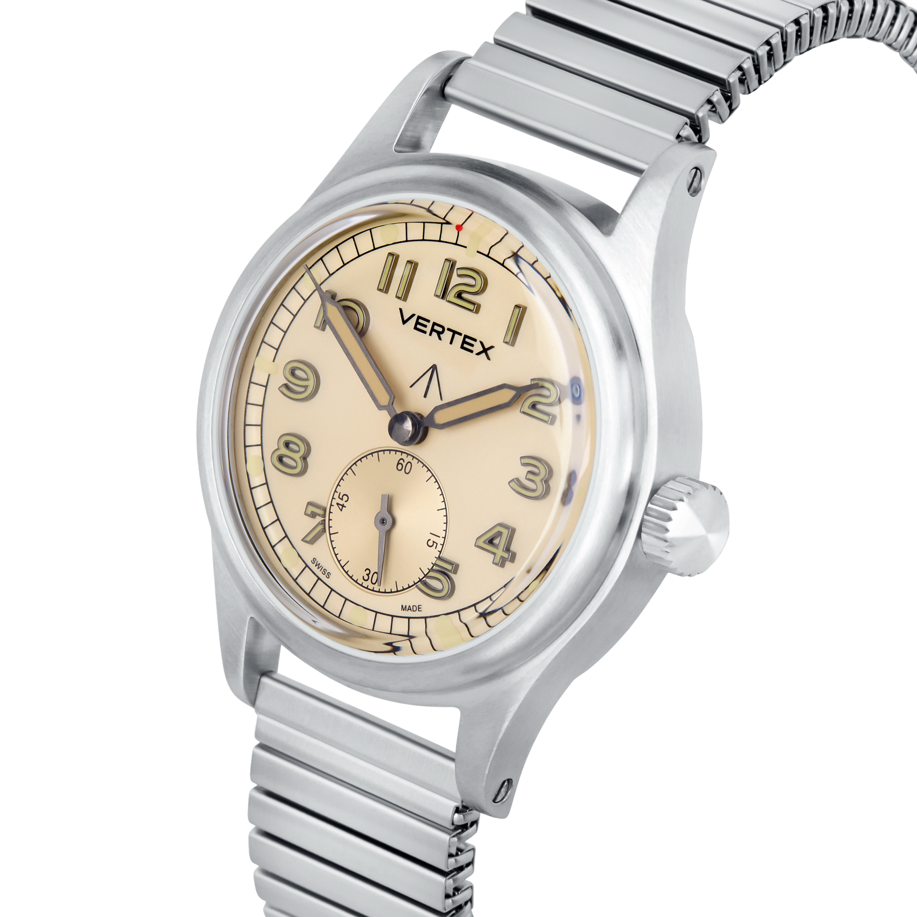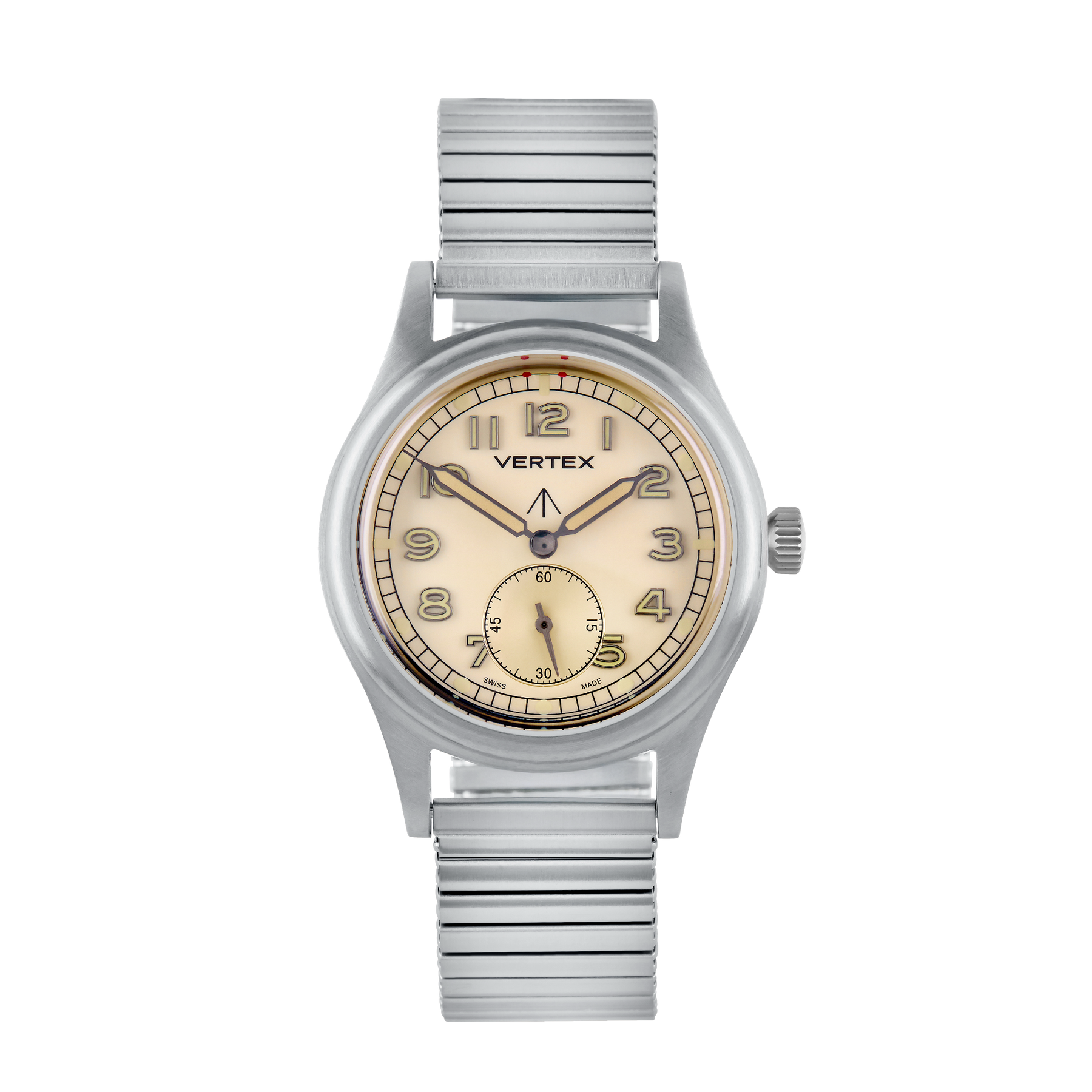 At its heart is a refined sand-coloured dial, designed to evoke the shifting tones of the desert landscape. For the first time on a Vertex watch, the model features filled metal indices, offering enhanced depth, clarity, and durability while maintaining the legibility that defines Vertex military timepieces.