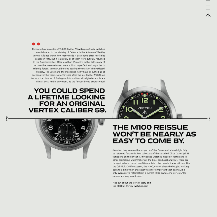 Vertex are commissioned to produce a mono-pusher timing watch, for ordnance disposal, but due to post-war rationing the watch is never produced.