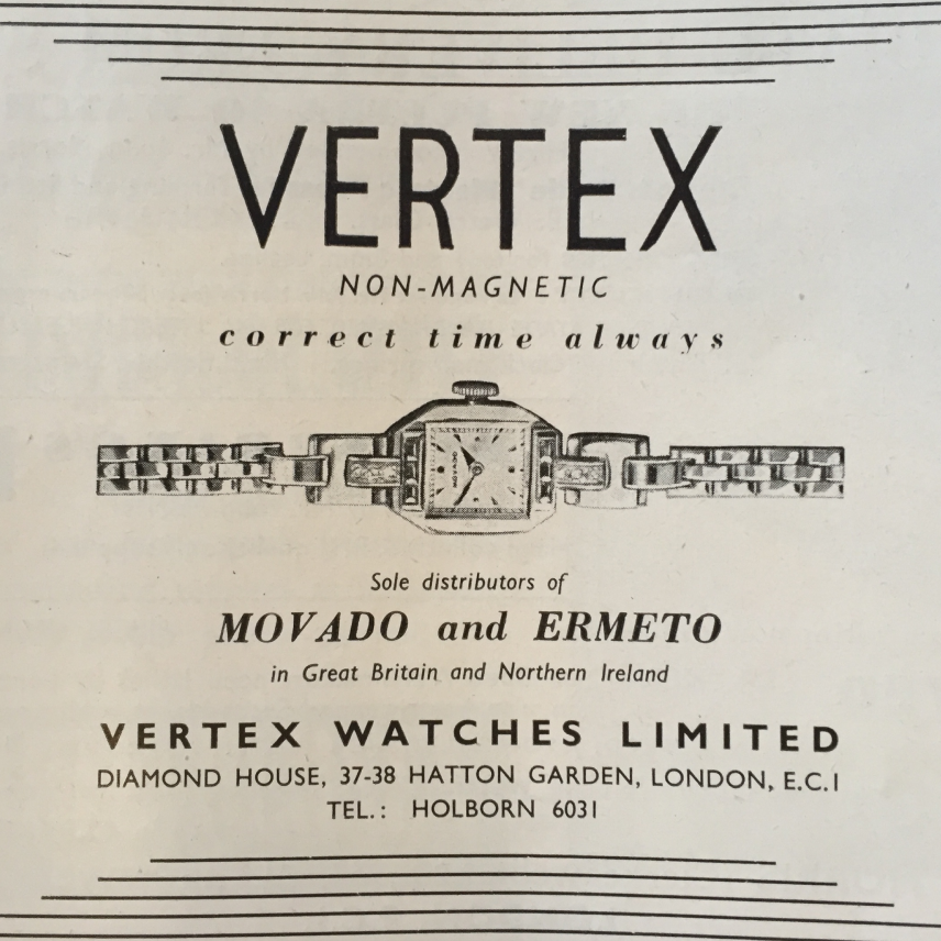 Vertex Watches Ltd is founded in London at 37 & 38 Hatton Gardens, and in Switzerland at 133 Rue de la Paix in La Chaux de Fonds.