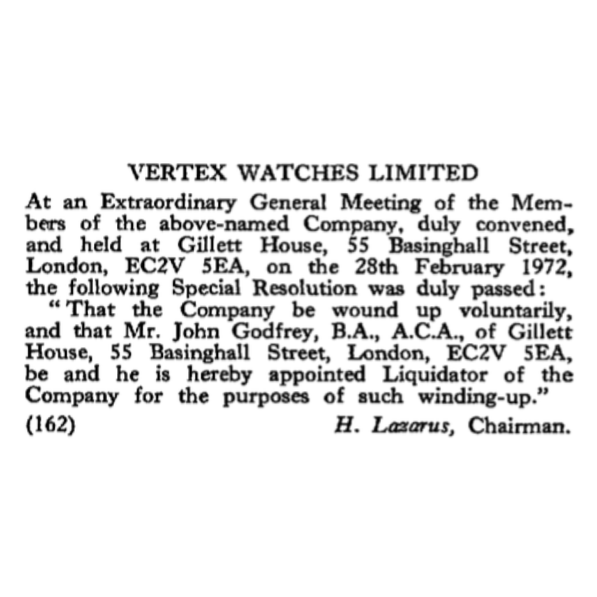Vertex falls victim to the “quartz crisis” - a largescale disruption in the horological industry caused by the advent of quartz watches. This, compounded with the expiration of Vertex’s lease in Hatton garden, forces Henry to close the company.